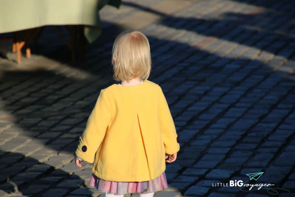 My little one walking the cobblestone way in her bright yellow coat, is the splash of colour this area needed.