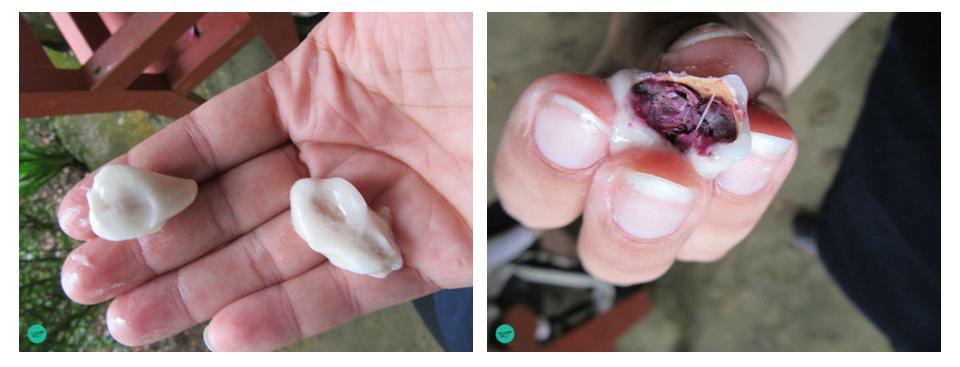 - The pulp around the beans is edible. Ripe fruit pulp is sweet, unripe a bit more like a lemon and the consistence is like a lychee. Biting in and open the bean the taste gets bitter, bitter like real dark pure chocolate.