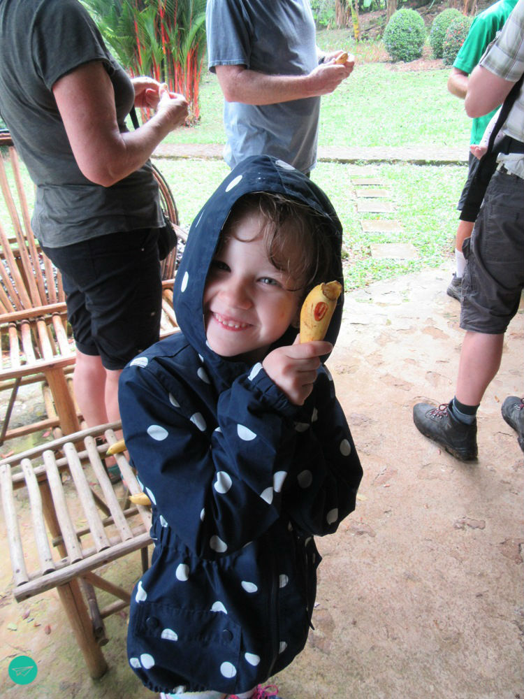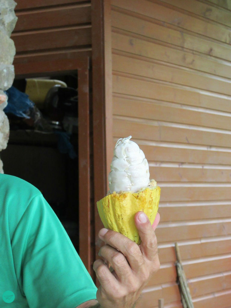 Cacao trees need water and warm temperatures, so Saint Peter did them a favor that day and let it rain. We didn’t mind, we put on hiking boots and rain jackets. At about 30° it’s not getting cold anyways. Before the tour starts we got a little introduction about the history of the farm, cacao trees and the cacao business in general. To be strengthened for the tour and walk to come, they served some bananas from their own harvests.