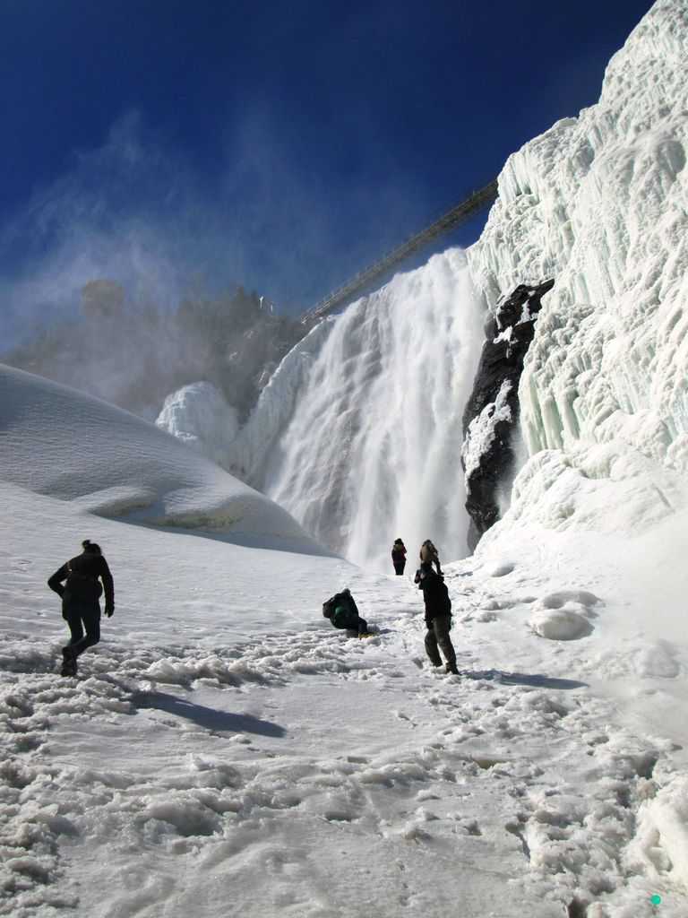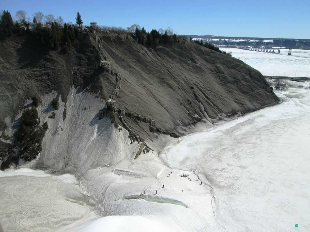 The frozen falls built ice bergs out of their spray! The lake at the bottom – frozen – so we could walk on it and „touch“ the falls! Climbing up again, I got flashed the second time. The look from above was just – wow. Ice, ice and more ice! Winter had turned everything into a land of ice. Even the St. Lawrence River was nothing but made of ice. The only exception was the highway which runs between the falls and the river. At this time of the year theoretically it is possible to walk from north to south shore on the St. Lawrence. But see yourself: