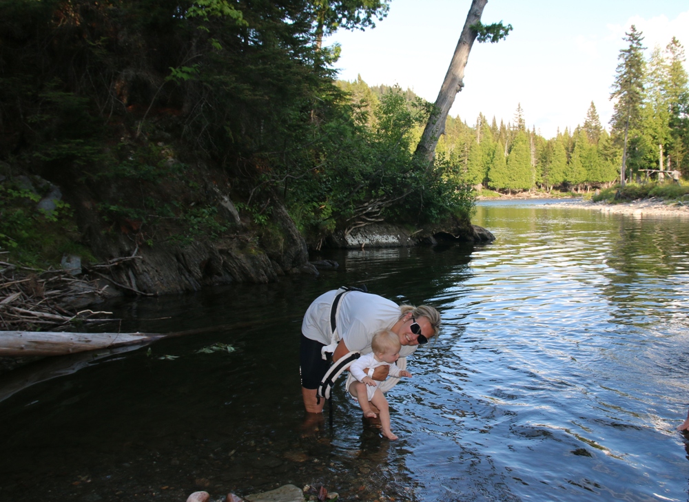 The day was still young so we stopped along the 299 on our way back for a walk and a small Kneipp treatment. The toddlers and us had fun and enjoyed. The point we stopped couldn’t have been better chosen. The scenery was like in a travel brochure about Canada. A river and two fishermen in the woods and a small cabin behind. Two of our friends, Big J and her friend were brave enough to take a bath. Me and little J went for a small cool down, too.